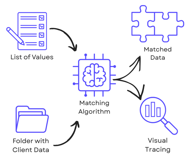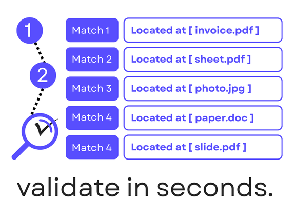 After matching your data, our tool will provide you with real-time analytics. We provide everything from accuracy to difference, or a marked location, where and in which document your match was found.